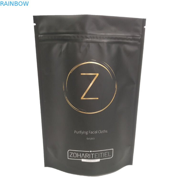 โลโก้ OEM Sac Plastique สีดำพร้อมซิปสำหรับผ้าทำความสะอาดผิวหน้าแบบกำหนดเอง Stand Up Pouch Bag กระเป๋าใส่เครื่องสำอางค์